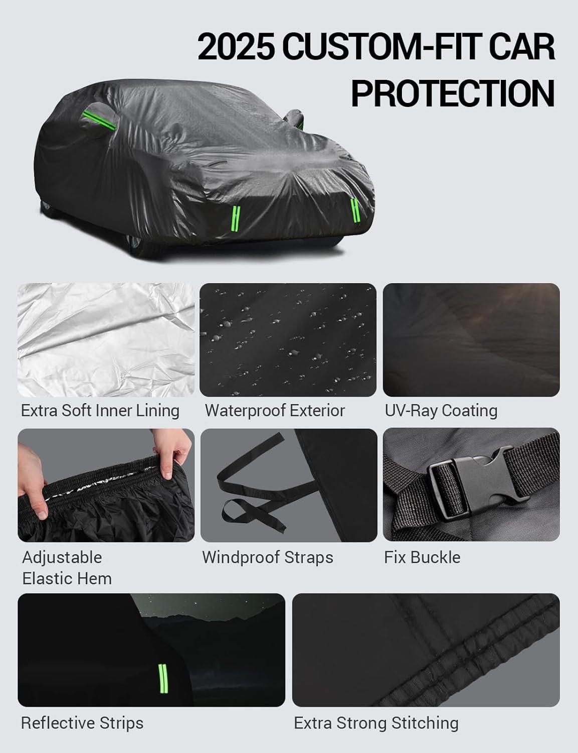 100% Waterproof: Crafted from 100% waterproof material, Multi-layer design, the car cover effectively stops rain from seeping in and has a ventilation feature that allows airflow and reduces moisture buildup, keeping your car dry. The soft inner design also prevents scratches, dust-proof suitable for both indoor and outdoor use