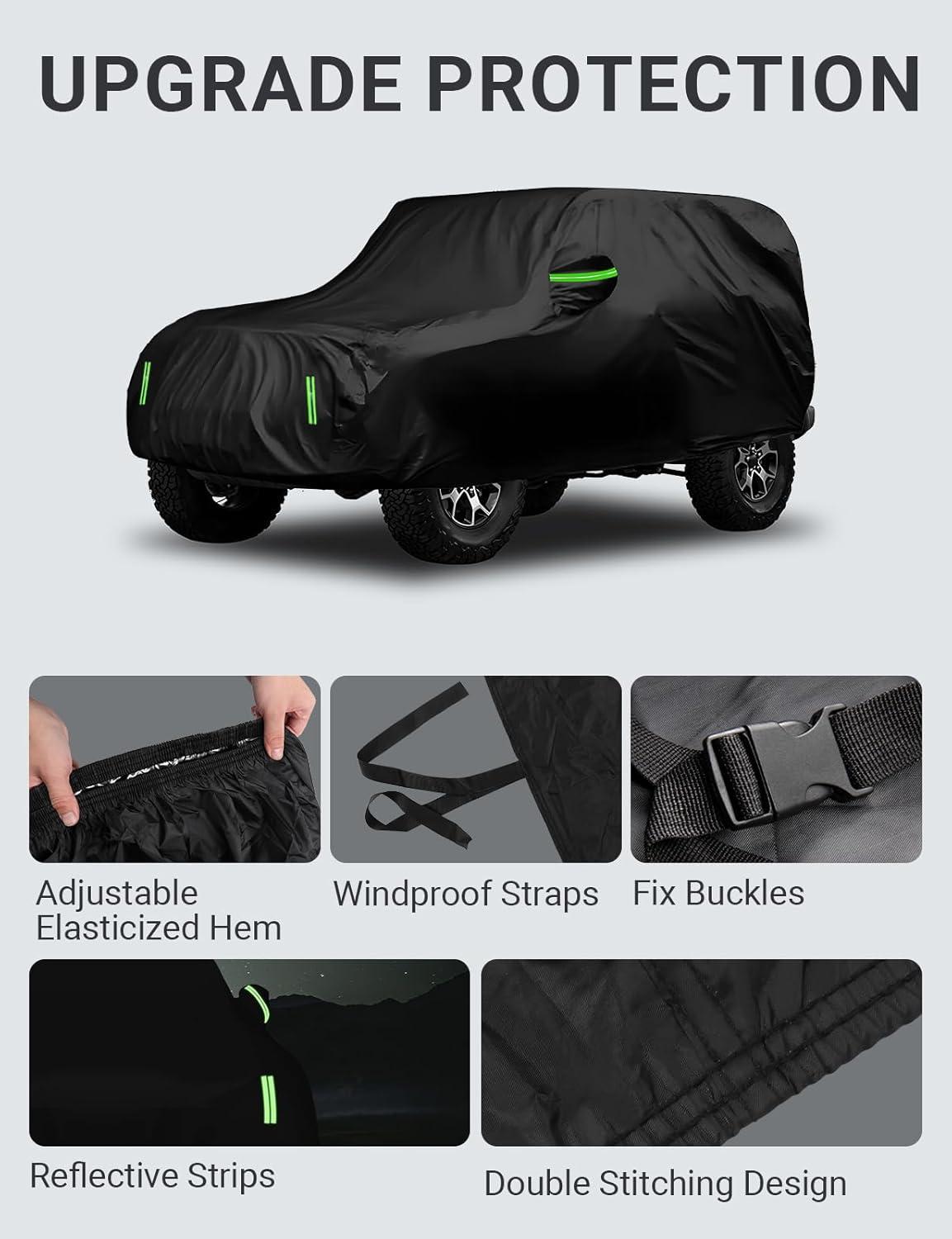 Upgraded Wind-Proof Design: The newly upgrade exterior covers uses a strong elasticized hem + double fixes buckles + four windproof straps to prevent the Kia K4 cover from being blown away by heavy winds. Precise double-stitching technology ensures cover more wear and tear resistant