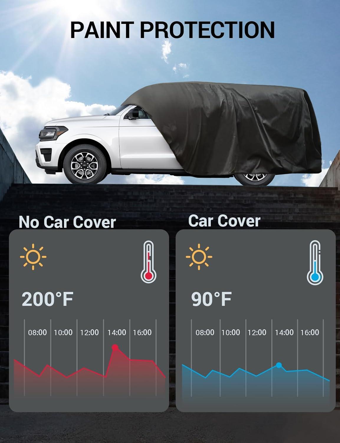 100% Waterproof: Crafted from 100% waterproof material, Multi-layer design, the car cover effectively stops rain from seeping in and has a ventilation feature that allows airflow and reduces moisture buildup, keeping your car dry. The soft inner design also prevents scratches, dust-proof suitable for both indoor and outdoor use