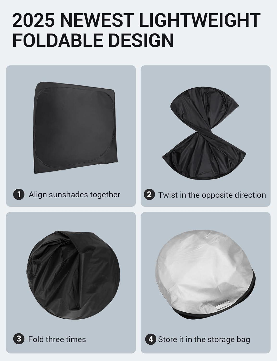 Excellent Material: Our front windshield shade is made of high-quality fabric that blocks and reflects heat, harmful UV rays, and sunlight while being less prone to wrinkling. The reinforced steel bezel ensures a longer and safer life for your windshield shade.