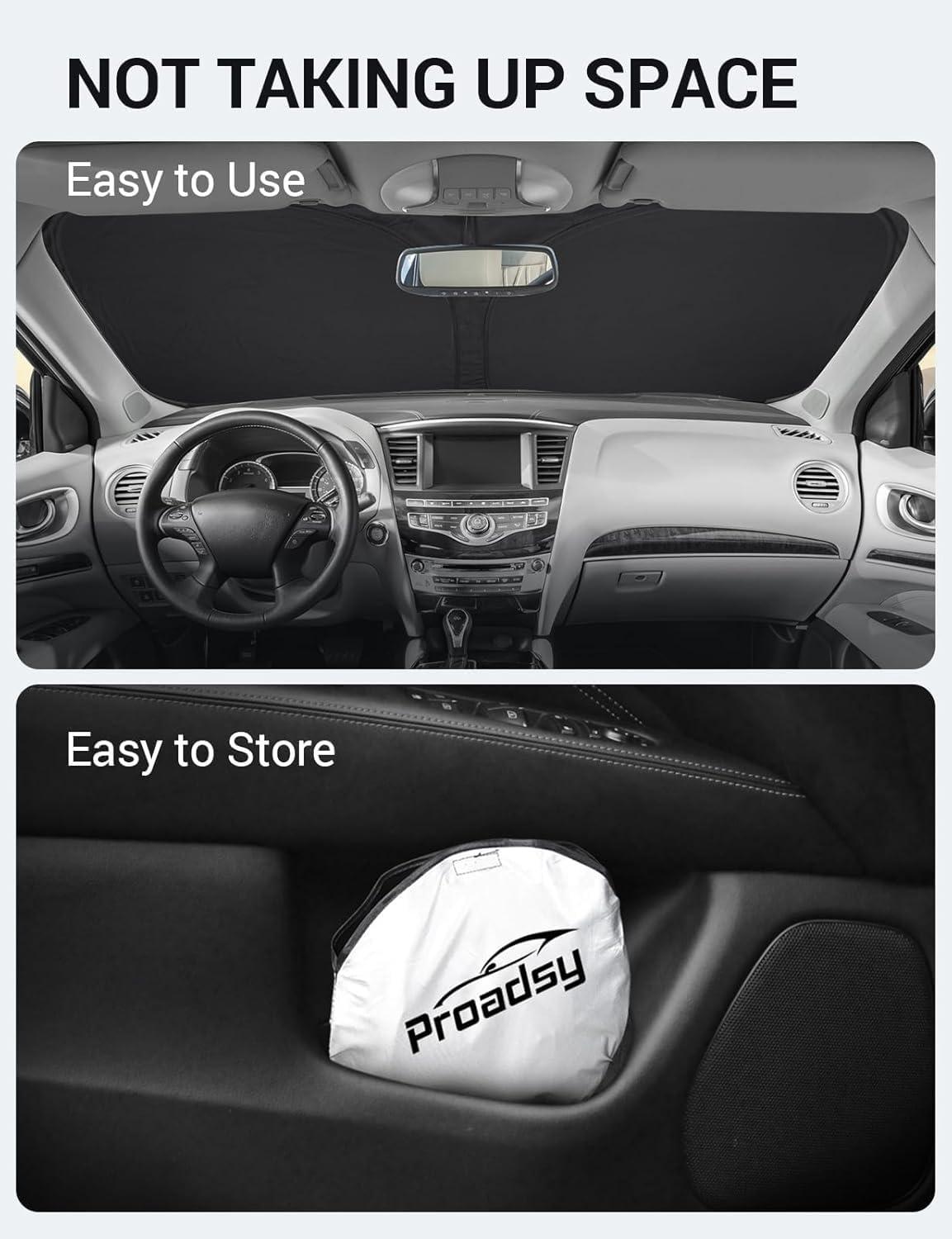 Easy to Use and Store: Unlike other products on the market, our windscreen sun visor is designed to be easy to use and store with its lightweight and collapsible material. The windscreen sunshade can be popped up and folded in seconds for everyday use and fits easily in your door pocket.