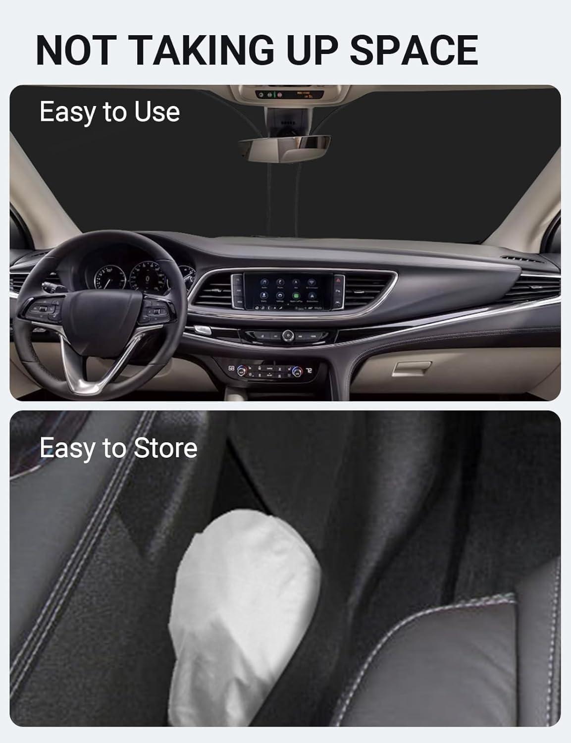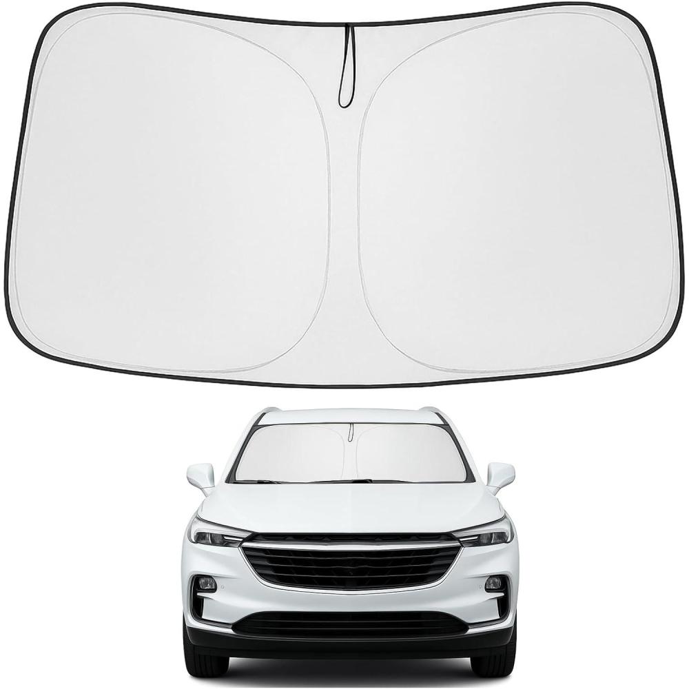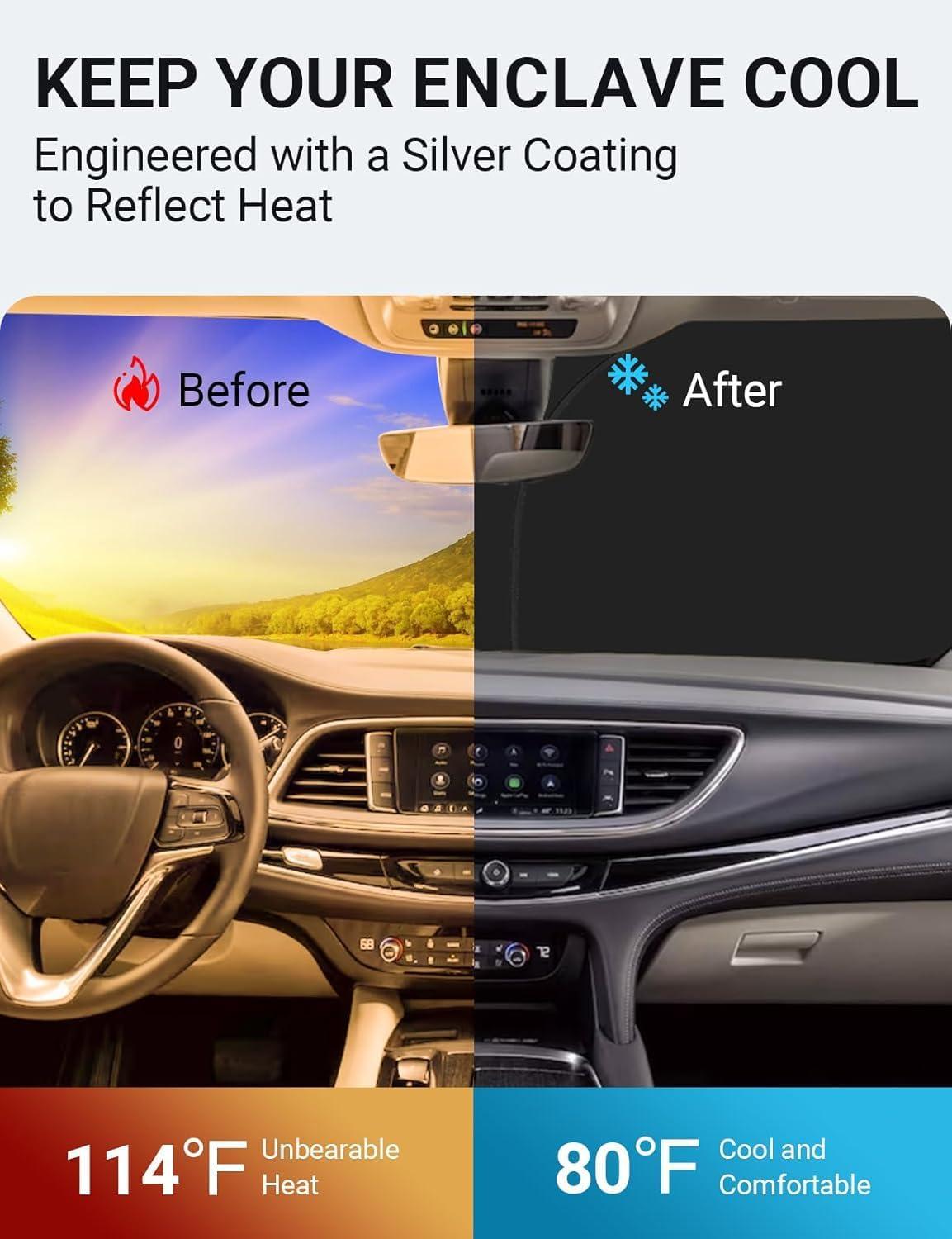 Certified Sustainable. DESIGNED IN USA!!! Custom Design: The front windshield shade has been custom cut specifically for Buick Enclave. Precise fit design and Reinforced steel rings make a precise and secure fit to the window, no need to use suction cups to hold it in place. It won't sag or collapse like other car heat shields. Fits for Buick Enclave 2026 2025 2024 2023 2022 2021 2020 2019 2018.