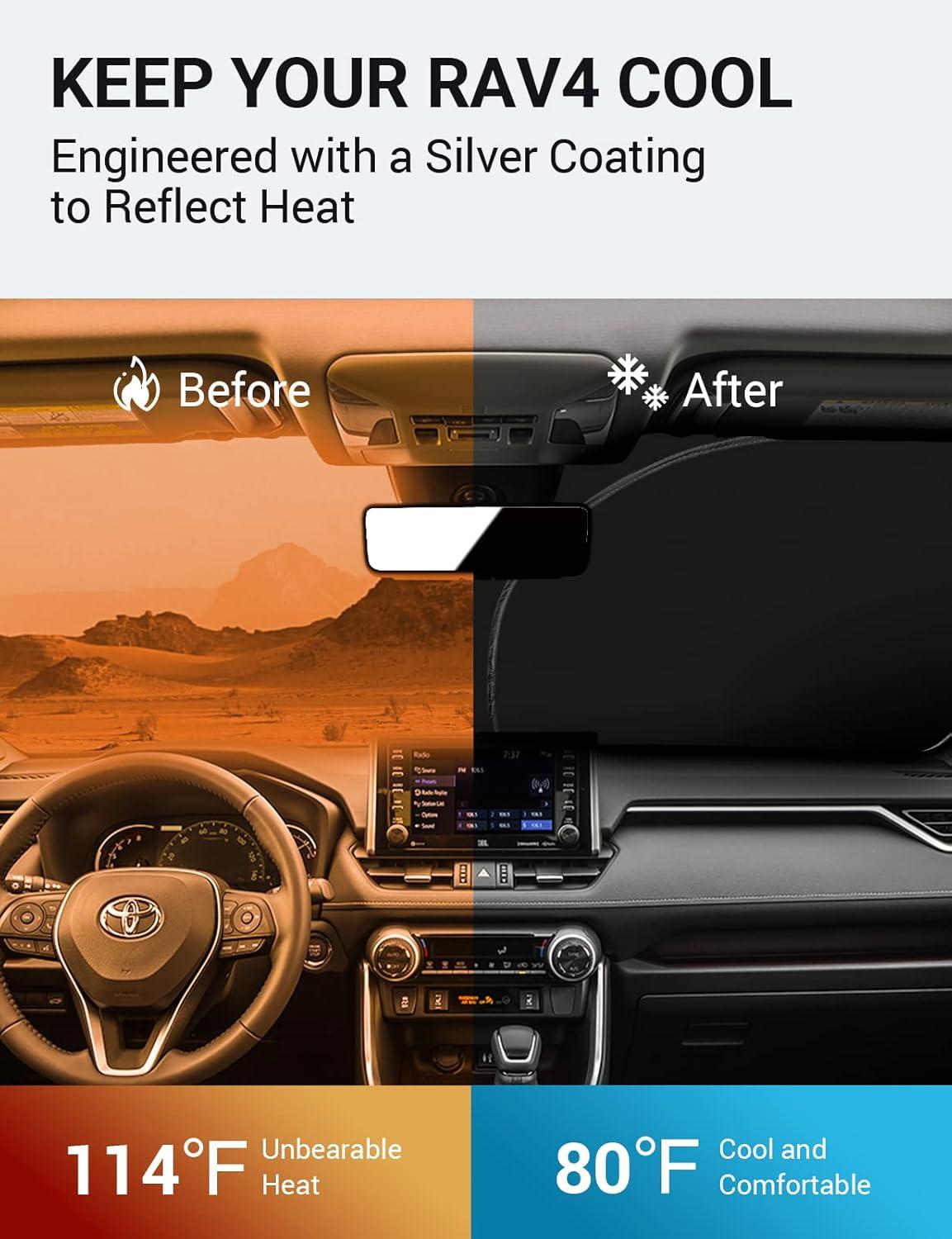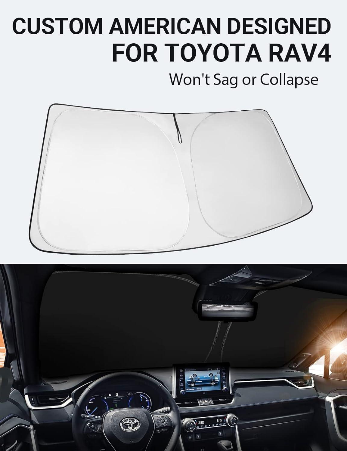 DESIGNED IN USA!!! Custom Design: The front windshield shade has been custom cut specifically for RAV4. Precise fit design and Reinforced steel rings make a precise and secure fit to the window, no need to use suction cups to hold it in place. It won't sag or collapse like other car heat shields. Fits for RAV4 2023 2022 2021 2020 2019.