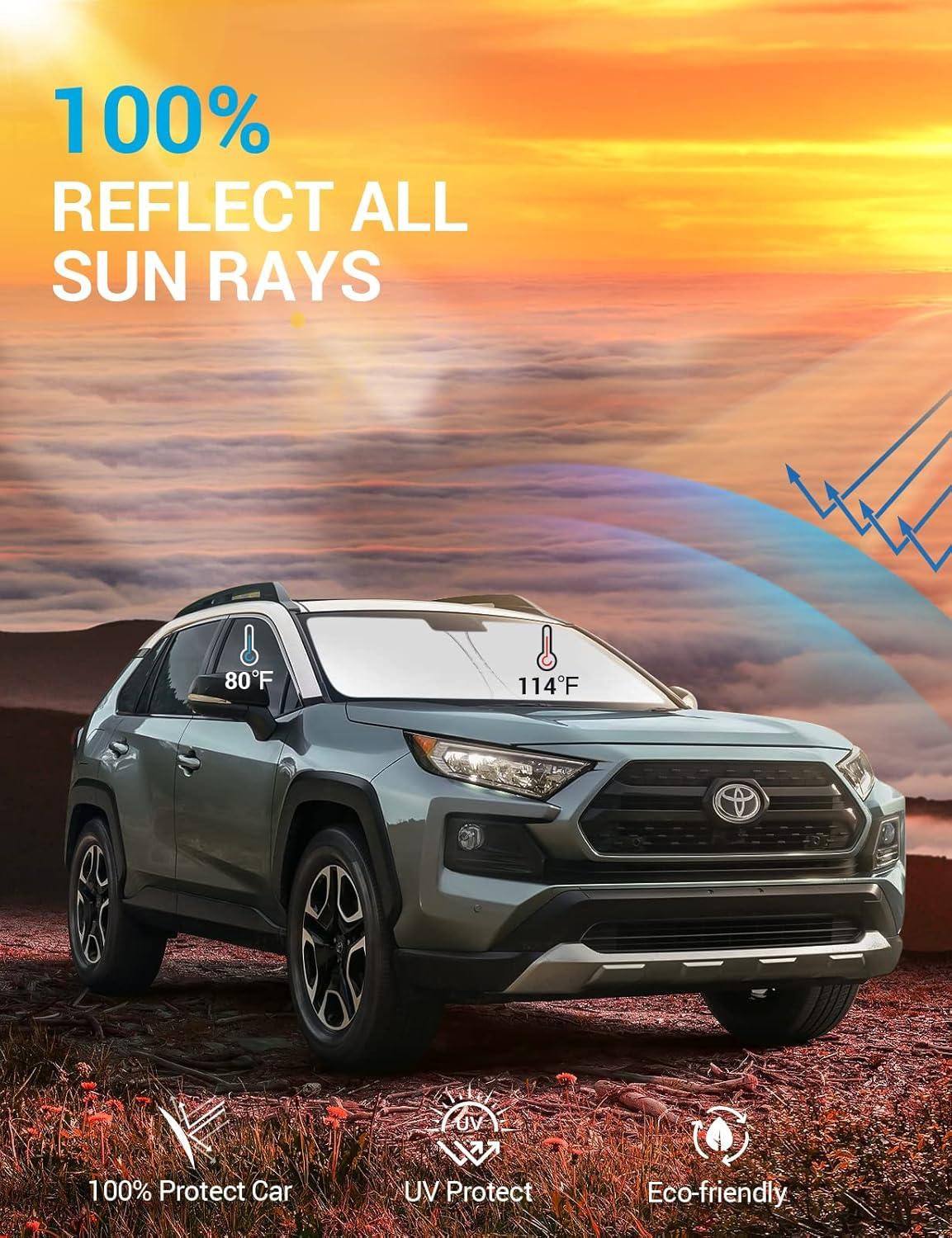 Upgrades Design Sunshade: The windshield cab shade for RAV4 boasts a double layer of heat shield fabric to keep out the sun. The first layer is premium 210T reflective polyester and the second layer is high-quality fabric. Double insulation, and double protection. The best shade and insulation on the market.