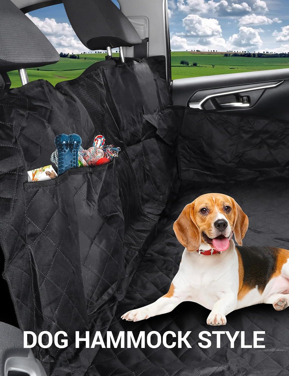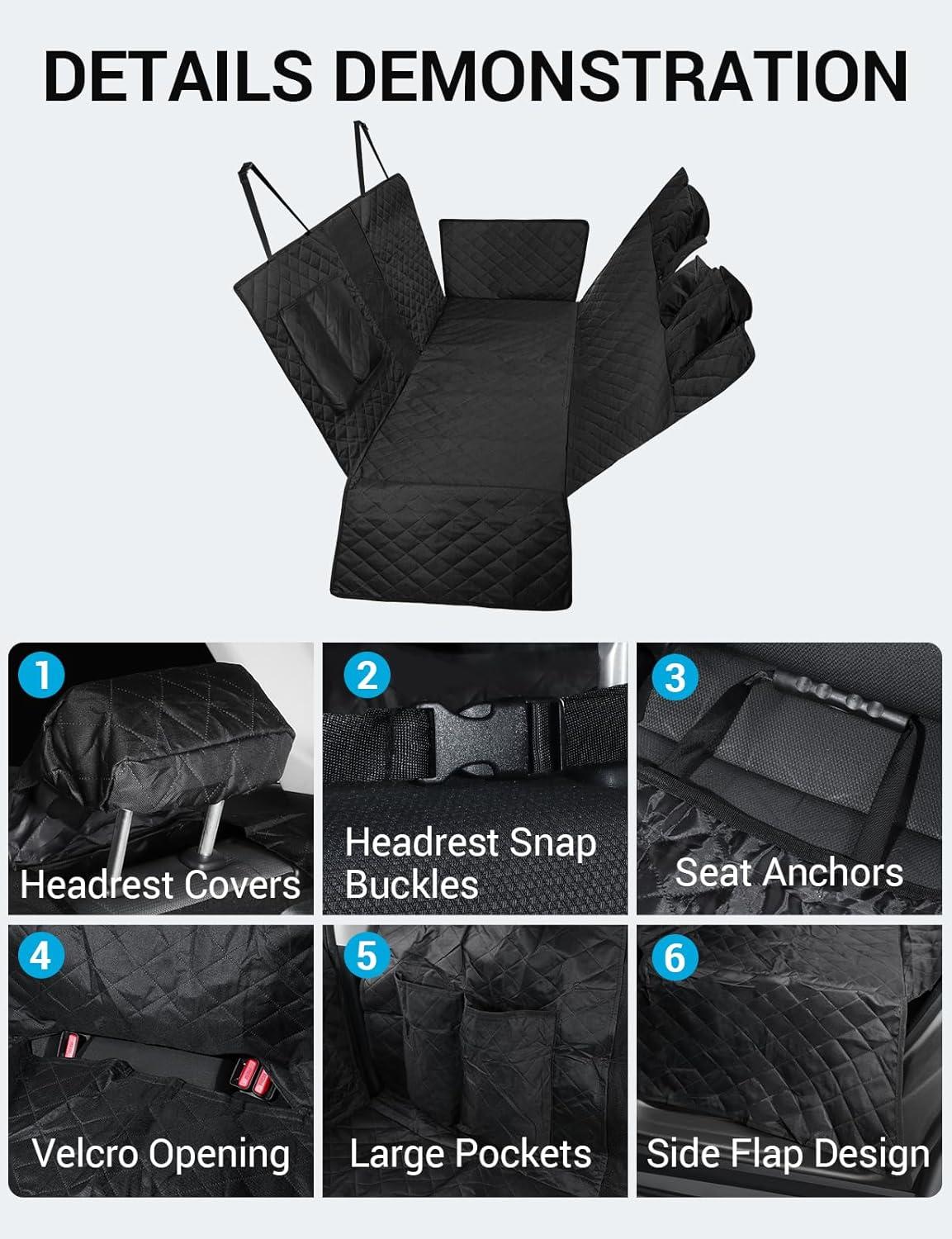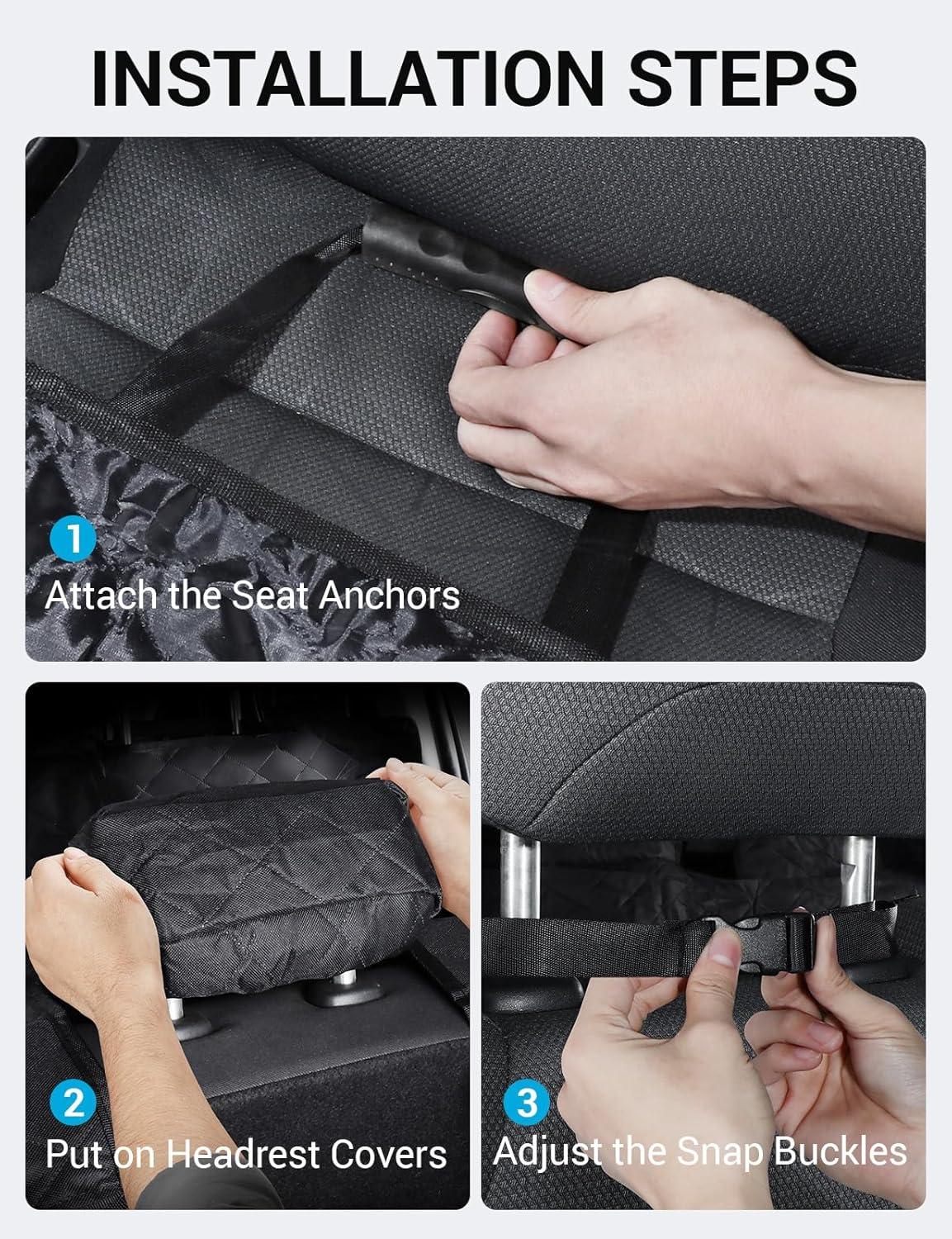 Won’t Sag&Slip: Our pets back seat covers come with patented fixed headrest covers, adjustable headrest straps, seat anchors, and velcro seatbelt openings for stable installation in seconds. Safeguard your dog during turns and stops, giving you peace of mind on the road.