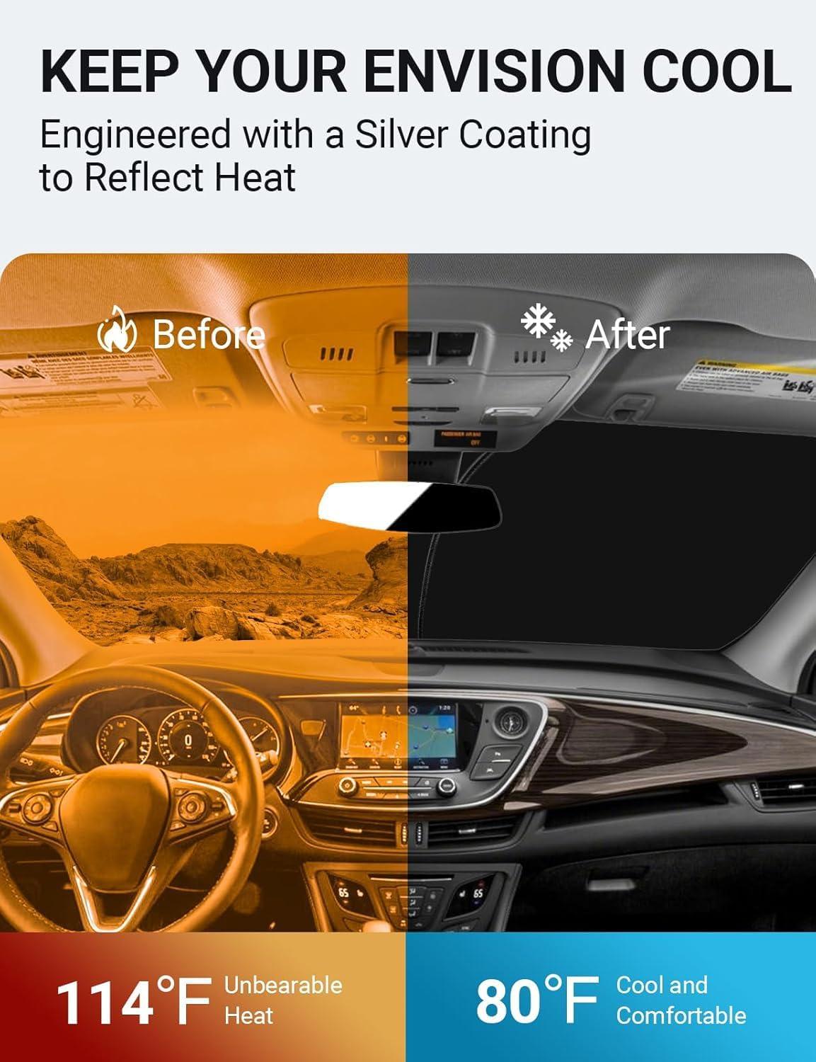 Keep Car Cooler: Engineered with a silver coating, our sun visor protector reflects heat, reducing heat buildup by up to 40°F and blocking 99% of harmful UV rays. It helps keep your car cooler and prevents leather seats from cracking and fading.
