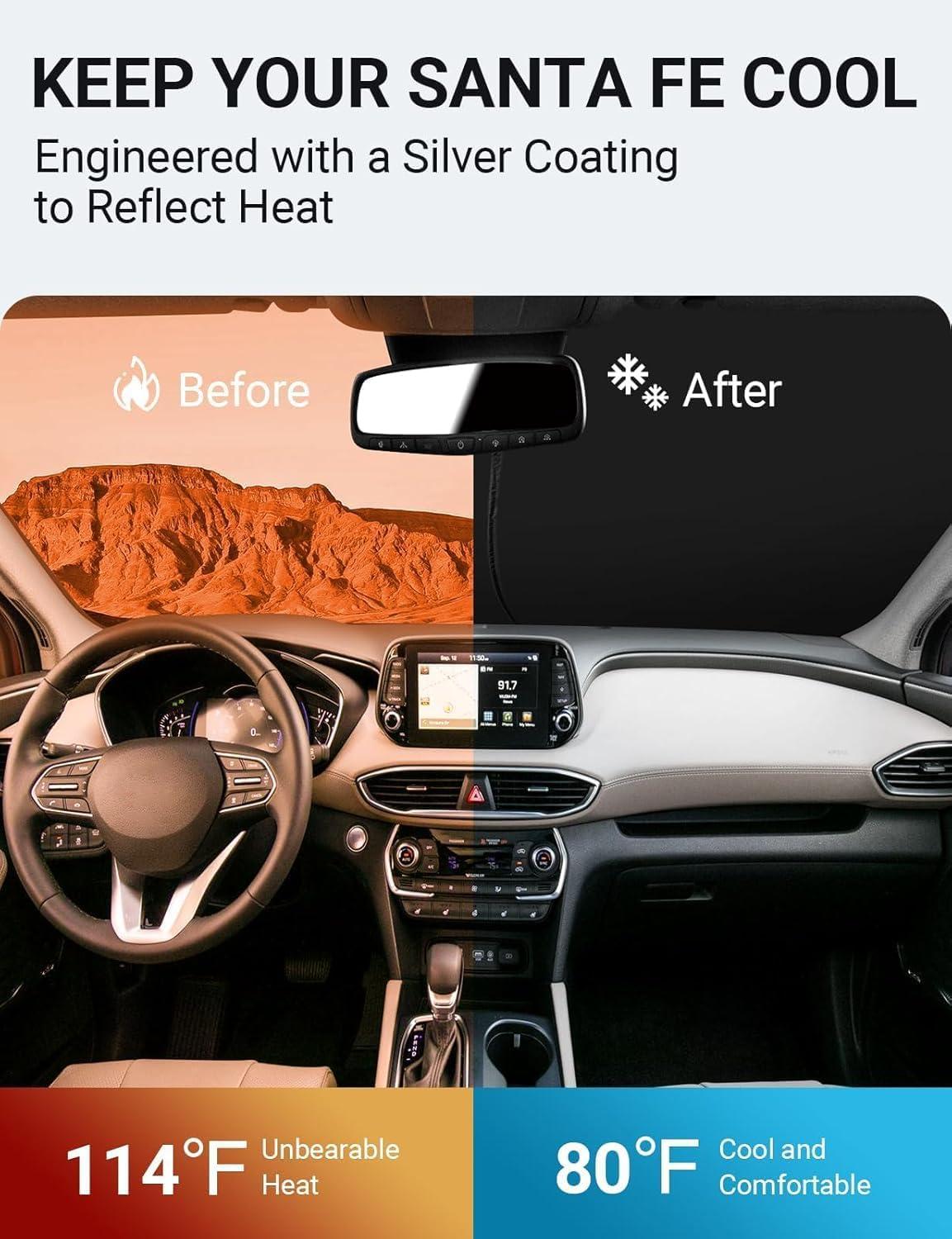 Keep Car Cooler: Engineered with a silver coating, our sun visor protector reflects heat, reducing heat buildup by up to 40°F and blocking 99% of harmful UV rays. It helps keep your car cooler and prevents leather seats from cracking and fading.