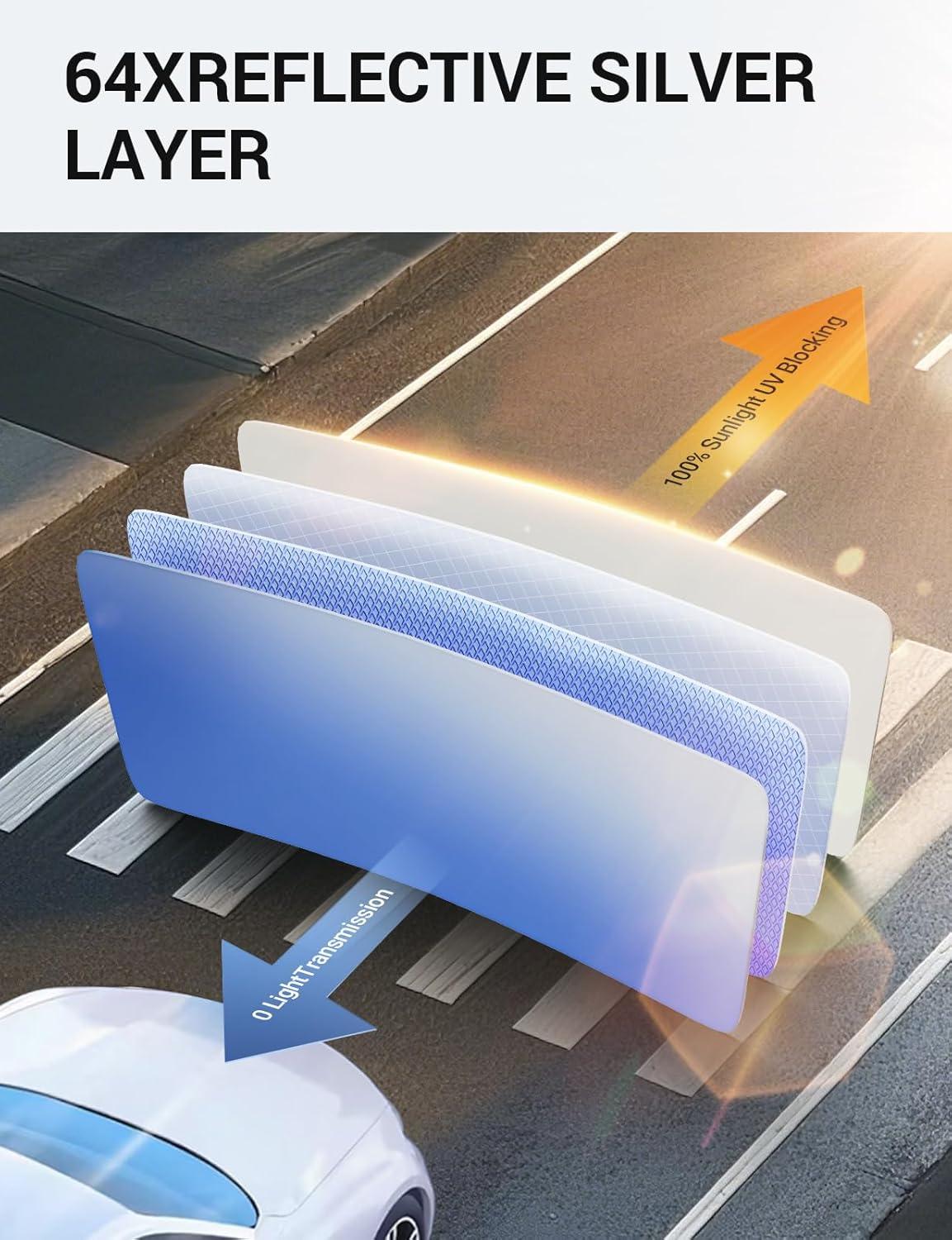 Upgraded 4-Layer Sunshade: The windshield cab shade boasts 4 layer of heat shield fabric to keep out the sun. The first layer is premium 240T reflective polyester, while the second layer is high- quality fabric. Double insulation and protection, making it the best shade and insulation on the market.
