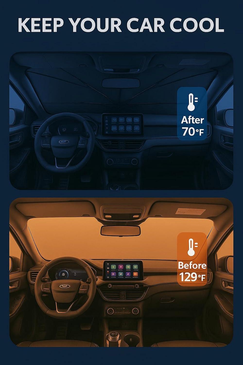 Innovative Ice Crystal Material: The sunshade adopts a 4-layer design, which is thick enough to effectively block and reflect sunlight. After multiple uses, it is still strong and not easy to tear. The sunshade also uses innovative ice crystal materials to evenly distribute heat, quickly cool down, and keep your car cool all the time. You no longer have to worry about getting your seat or car handle scalded by high temperatures.