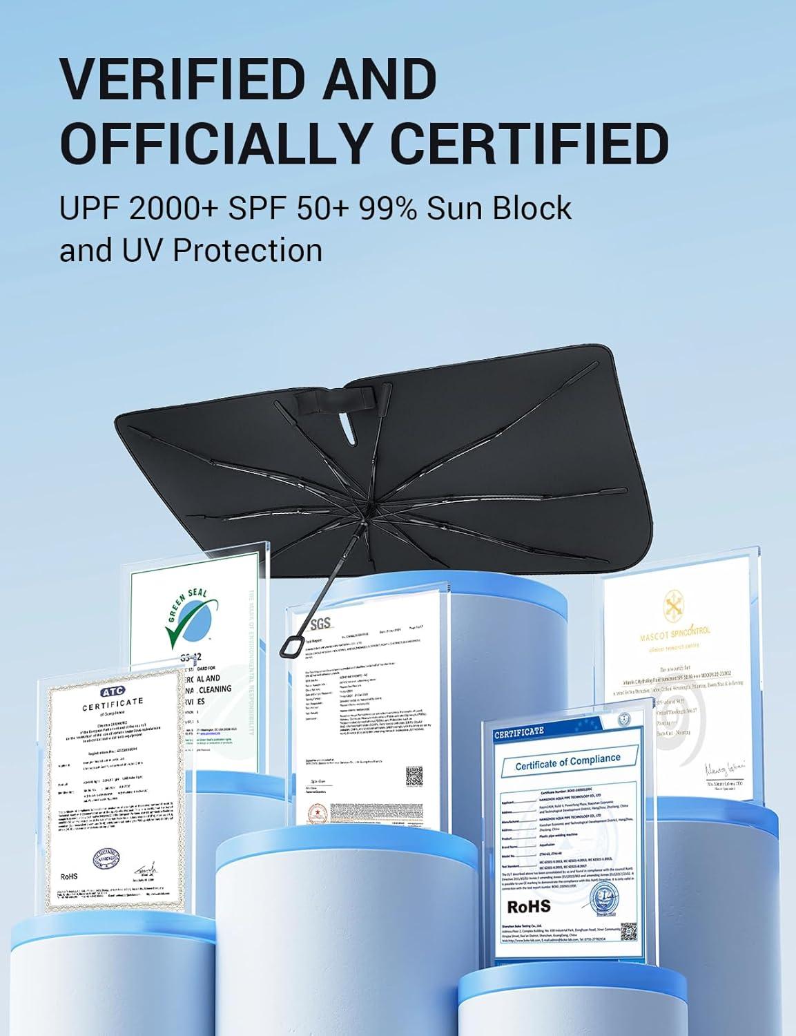 Certified Sustainable. Customized Windshield Sunshade: Specially designed for the 2022-2025 Hyundai Tucson with precise mirror cutouts, providing 100% shading, carbon fiber handle, ensuring lightweight and durability while also having a fashionable feel. Our Tucson windshield sunshade can protect the interior of your car from various light damage and prevent dashboard and seat degradation.