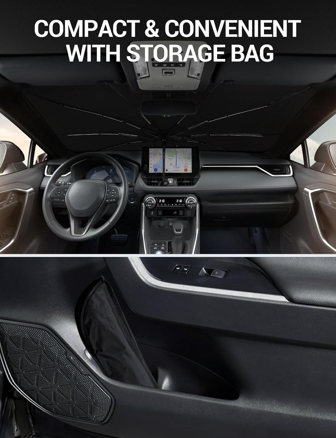 Certified Sustainable. Customized Windshield Sunshade: Specially designed for the 2022-2025 Hyundai Tucson with precise mirror cutouts, providing 100% shading, carbon fiber handle, ensuring lightweight and durability while also having a fashionable feel. Our Tucson windshield sunshade can protect the interior of your car from various light damage and prevent dashboard and seat degradation.
