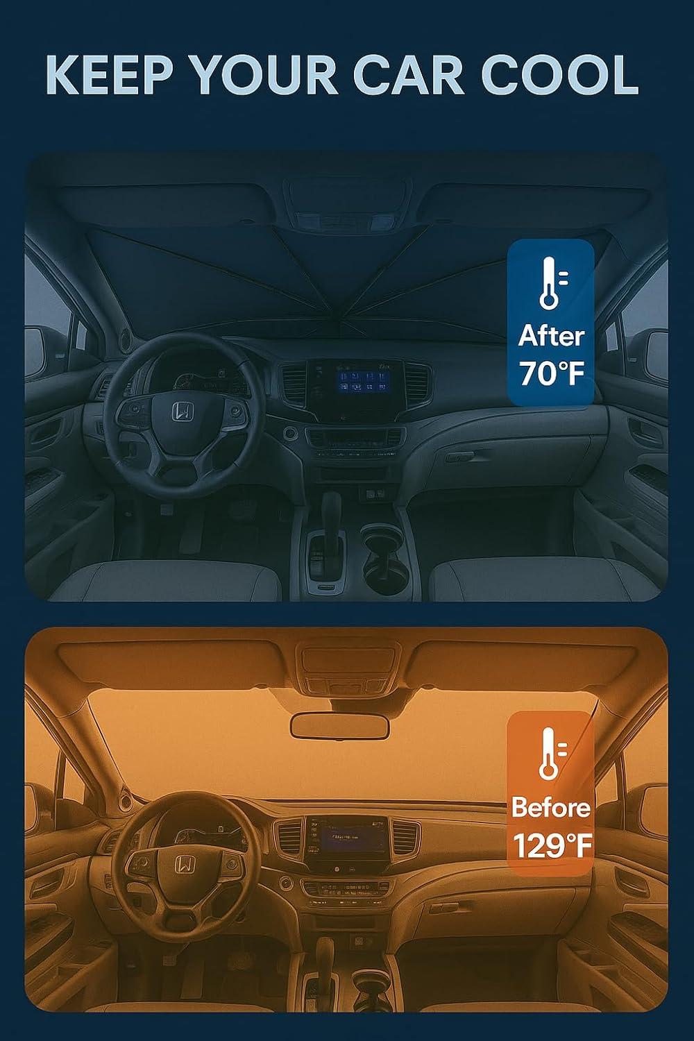 Innovative Ice Crystal Material: The sunshade adopts a 4-layer design, which is thick enough to effectively block and reflect sunlight. After multiple uses, it is still strong and not easy to tear. The sunshade also uses innovative ice crystal materials to evenly distribute heat, quickly cool down, and keep your car cool all the time. You no longer have to worry about getting your seat or car handle scalded by high temperatures.