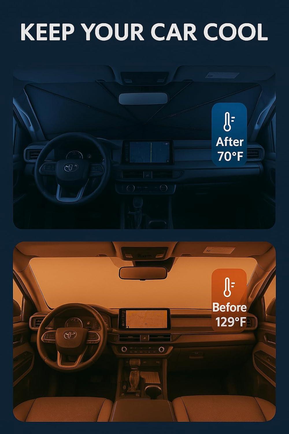Innovative Ice Crystal Material: The sunshade adopts a 4-layer design, which is thick enough to effectively block and reflect sunlight. After multiple uses, it is still strong and not easy to tear. The sunshade also uses innovative ice crystal materials to evenly distribute heat, quickly cool down, and keep your car cool all the time. You no longer have to worry about getting your seat or car handle scalded by high temperatures.